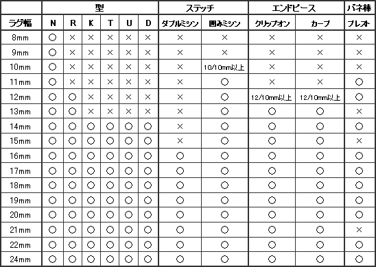 ※囲みミシンはN型及び標準エンドピースの場合のみの対応とさせて頂きます。 ※クリップオンはN/R/K型のみの対応とさせて頂きます。 ※プレスト(ワンタッチ式バネ棒)は標準エンドピースの場合のみ可能となります。 ※ガルーシャはサイズ12/12mm以上のN型のみです。また、ステッチ及びその他オプションには対応できません。